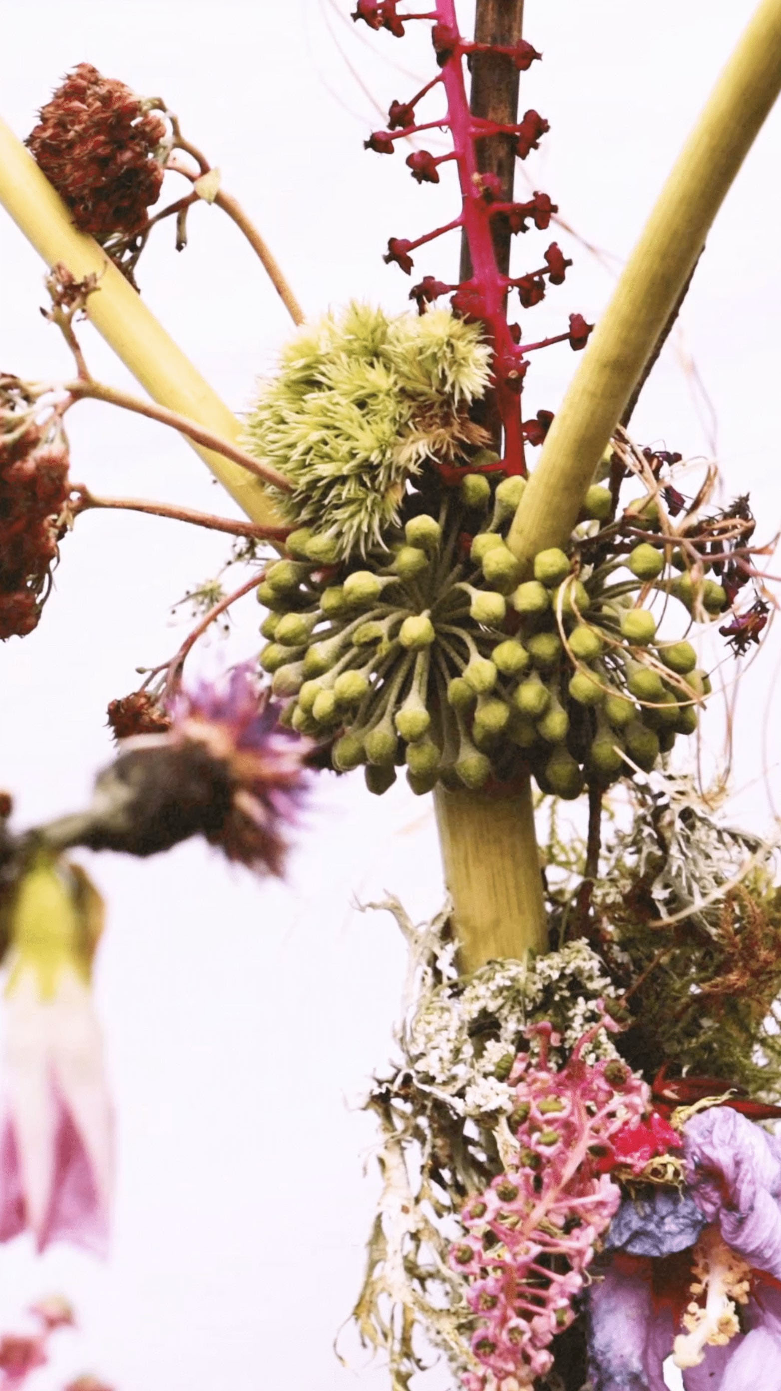 Arbres à fleurs multiples is a video installation featuring four “flower trees”: plant compositions imagined by Minh Lê Boutin. These trees embody both the experience of collecting in nature - specific to a flora and a season - and that of creating a composition.